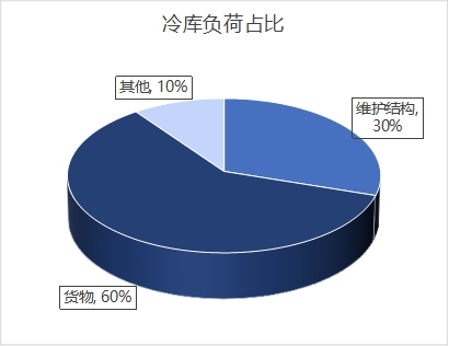 首先我們需要了解冷庫(kù)的負(fù)荷組成,冷庫(kù)負(fù)荷主要包括圍護(hù)結(jié)構(gòu)負(fù)荷,進(jìn)貨貨物負(fù)荷(不超過庫(kù)容量的10%),照明、設(shè)備、人員操作負(fù)荷。其中維護(hù)結(jié)構(gòu)的負(fù)荷占比達(dá)20~30%,貨物負(fù)荷占比60%左右,其他占10%。
